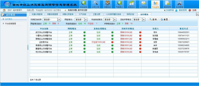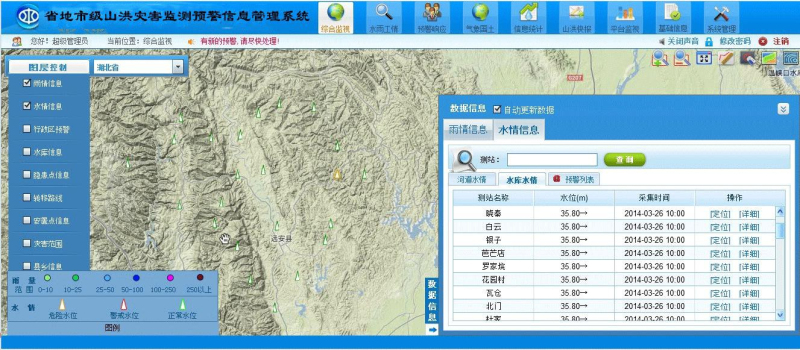 系統(tǒng)匯集了轄區(qū)內縣級監(jiān)測預警平臺的實時監(jiān)測預警等各類信息,對匯集的數(shù)據(jù)進行分析整理、匯總統(tǒng)計、共享上報,為省、地市級防辦及有關部門及時掌握監(jiān)測預警信息,了解山洪災害防御態(tài)勢,對縣級山洪災害預警響應監(jiān)督指導等提供支持,最大程度減少由山洪災害帶來的損失。