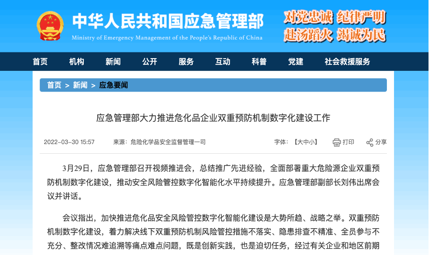 應急管理部大力推進危化品企業(yè)雙重預防機制數(shù)字化建設工作,3月29日,應急管理部召開視頻推進會,總結(jié)推廣先進經(jīng)驗,全面部署重大危險源企業(yè)雙重預防機制數(shù)字化建設,推動安全風險管控數(shù)字化智能化水平持續(xù)提升。應急管理部副部長劉偉出席會議并講話。會議指出,加快推進危化品安全風險管控數(shù)字化智能化建設是大勢所趨、戰(zhàn)略之舉。雙重預防機制數(shù)字化建設,著力解決線下雙重預防機制風險管控措施不落實、隱患排查不精準、全員參與不充分、整改情況難追溯等痛點難點問題,既是創(chuàng)新實踐,也是迫切任務,經(jīng)過有關企業(yè)和地區(qū)前期試點,推進雙重預防機制數(shù)字化建設條件成熟、正當其時。