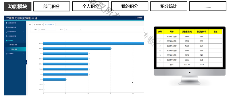 根據(jù)隱患級別,設置不同級別隱患處置類型(上報、整改、復查等)積分規(guī)則,增設風險辨識、制度完善等其他加分項目,計算部門/個人隱患閉環(huán)率、部門/個人上報率等因子,以及逾期整改等行為扣分規(guī)則,搭建部門/個人積分評價體系。自動計算各個部門的積分情況、各人員積分情況,統(tǒng)計各月度、年度激勵金額。