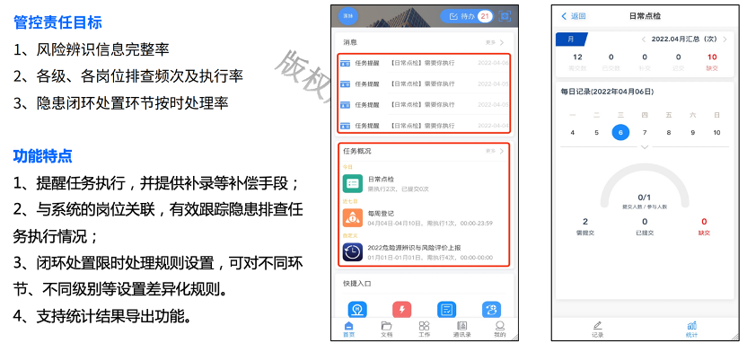 推動隱患排查工作全員化、全方位、全天候的良好運行,通過雙重預防機制數(shù)字化平臺,進一步優(yōu)化了隱患排查治理流程,隱患排查更聚焦、更有針對性。同時在公司隱患獎懲激勵制度的引導下,全員積極參與隱患排查治理,提高了員工排查隱患能力與積極性。雙重預防機制數(shù)字化平臺統(tǒng)計每周的隱患排查任務完成率、隱患整改完成率,對 24 小時內(nèi)即將超期未整改的隱患發(fā)出隱患超期提醒,強有力的保障公司各級隱患排查與治理工作有效實施。