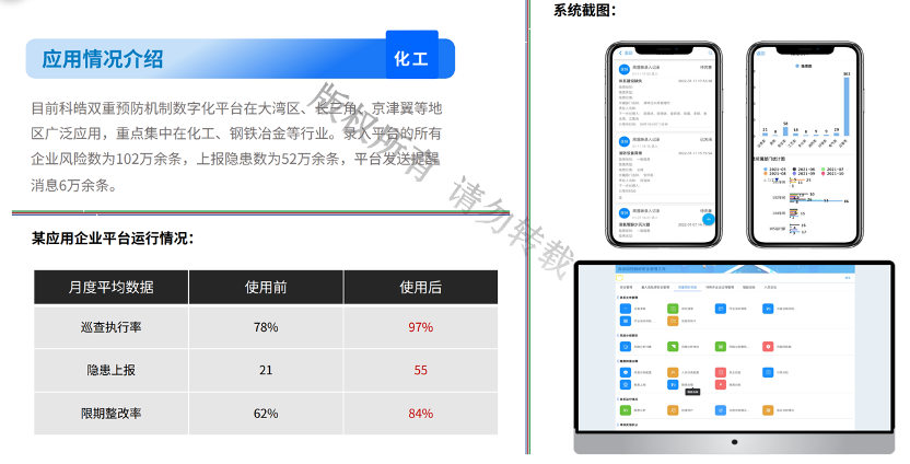 根據(jù)《危險化學品企業(yè)雙重預防機制數(shù)字化建設數(shù)據(jù)交換規(guī)范》,開發(fā)或改造雙重預防機制信息化系統(tǒng),包含電腦管理端和移動 APP 端。具備動態(tài)監(jiān)控安全風險管控措施落實、 隱患排查任務推送、隱患排查治理情況跟蹤監(jiān)督、機制運行 效果評估、異常狀態(tài)自動預警及考核獎懲等功能;具備標準化的數(shù)據(jù)接口及數(shù)據(jù)推送能力可實現(xiàn)與其他系統(tǒng)對接(監(jiān)管部門、公司自建其他業(yè)務系統(tǒng)比如:特殊作業(yè)、人員定位等)。