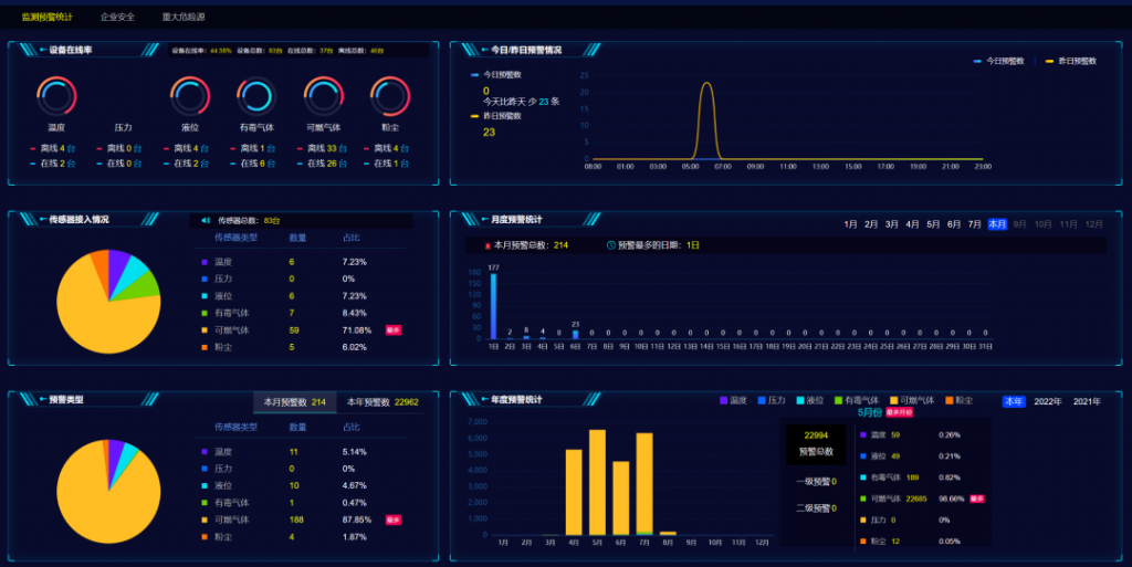 大數(shù)據(jù)畫像是以可視化的方式展示實(shí)時(shí)預(yù)警情況、設(shè)備在線率,傳感器接入情況、預(yù)警類型統(tǒng)計(jì)情況、月度預(yù)警統(tǒng)計(jì)和年度預(yù)警統(tǒng)計(jì)情況等,并進(jìn)行運(yùn)行情況的分析,結(jié)合統(tǒng)計(jì)圖表形成日報(bào)、周報(bào)、月報(bào),支持模板編輯、導(dǎo)入、導(dǎo)出。