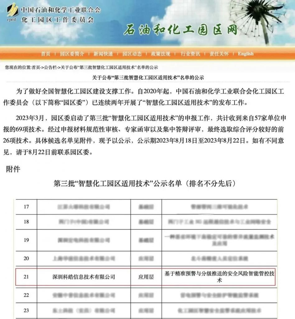 為了深入貫徹落實(shí)《工業(yè)和信息化部關(guān)于促進(jìn)化工園區(qū)規(guī)范發(fā)展的指導(dǎo)意見》《關(guān)于“十四五”推動(dòng)石化化工行業(yè)高質(zhì)量發(fā)展的指導(dǎo)意見》文件精神,做好智慧化工園區(qū)建設(shè)技術(shù)支撐工作,中國石油和化學(xué)工業(yè)聯(lián)合會(huì)化工園區(qū)工作委員會(huì)(下稱“園區(qū)委”)組織開展2023年(第三批)智慧化工園區(qū)適用技術(shù)的評(píng)審工作,科皓信息申報(bào)的“基于精準(zhǔn)預(yù)警與分級(jí)推送的安全風(fēng)險(xiǎn)智能管控技術(shù)”成功入選2023園區(qū)委(第三批)智慧化工園區(qū)適用技術(shù)。