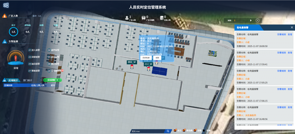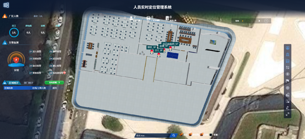 系統(tǒng)界面支持在平面地圖、地圖上直觀顯示現(xiàn)場人員位置,通過人員佩戴定位標(biāo)簽實(shí)時(shí)查看人員分布和在崗情況,且地圖支持縮放、分層、單擊建筑物等查看方式,點(diǎn)擊地圖中任一人員,顯示人員詳細(xì)信息。