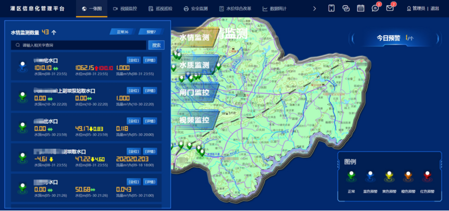 灌區(qū)信息化綜合管理平臺主要功能包括灌區(qū)運行一張圖、監(jiān)測預警、視頻監(jiān)控、巡視檢查、安全監(jiān)測、水價綜合改革、統(tǒng)計報表分析、水情整編、基礎信息管理、廣播信息發(fā)布、防汛物資管理、標準化管理、系統(tǒng)管理、表單管理、移動端、應用支撐平臺等。
