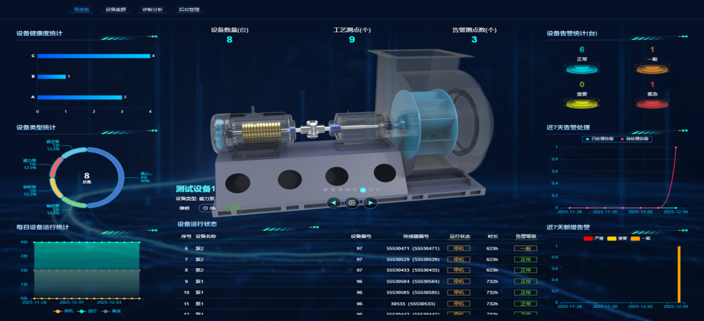 關(guān)鍵機(jī)泵狀態(tài)監(jiān)控詳情界面集中展示設(shè)備核心信息,包括設(shè)備編號(hào)、名稱、類型、所屬部門及位置。該界面提供設(shè)備健康度量化評(píng)分,并以顏色編碼直觀標(biāo)識(shí)健康狀況。同時(shí),集成了機(jī)泵平面模型展示功能,清晰呈現(xiàn)設(shè)備結(jié)構(gòu)。設(shè)備運(yùn)行狀態(tài)(如累計(jì)運(yùn)行時(shí)長、啟停次數(shù)、報(bào)警次數(shù))實(shí)時(shí)更新,并提供詳盡的報(bào)警與事件記錄,便于用戶及時(shí)掌握設(shè)備異常。